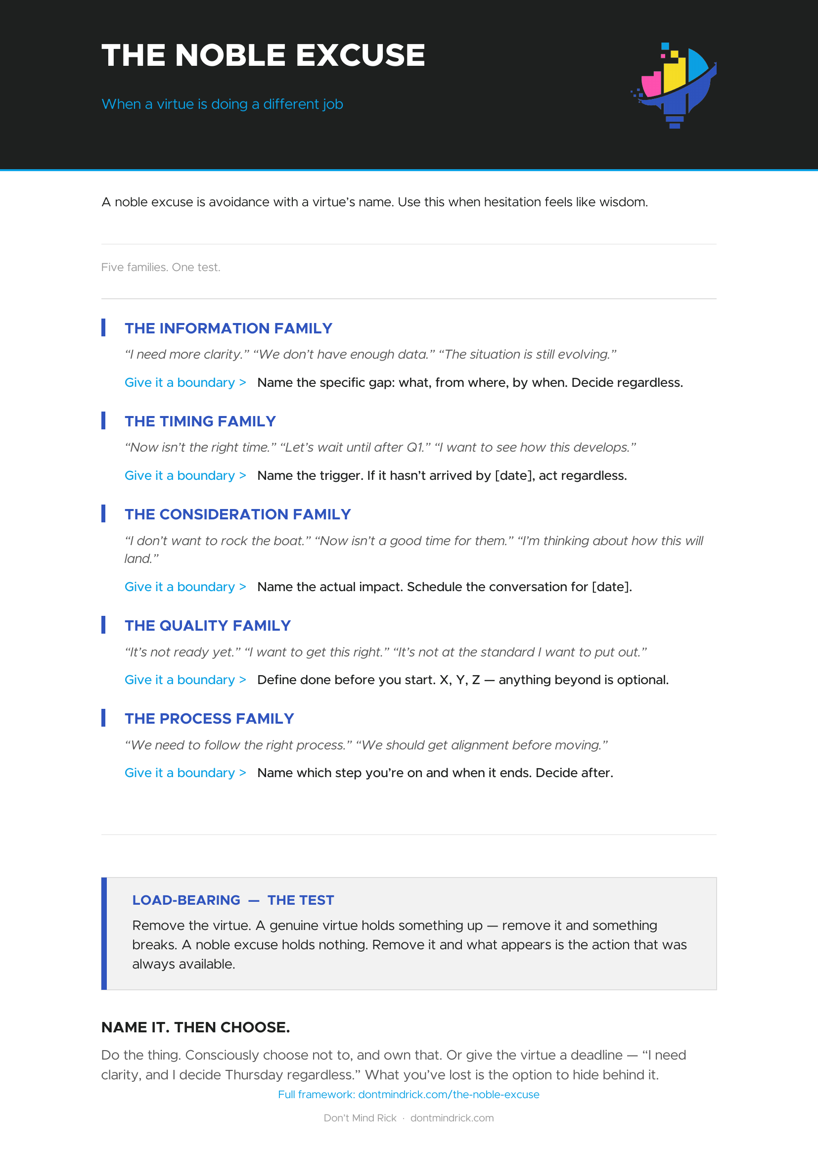 A noble excuse holds nothing. Remove it, and what appears is the action that was always available — the decision, the conversation, the thing to ship.
